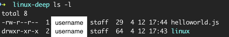 파일 helloworld.js는 -rw-r--r-- 이라고 출력되었고, 폴더 linux는 drwxr-xr-x 라고 출력되었습니다.