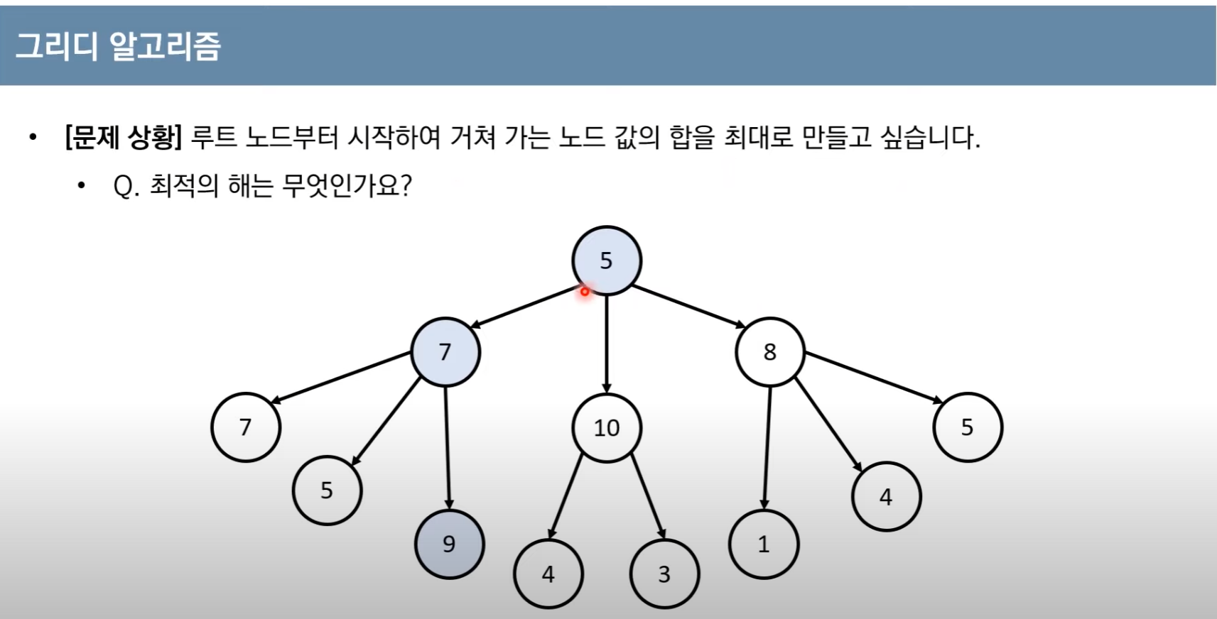 5-7-9가 가장 큰 값을 가집니다. 하지만 그리드 알고리즘을 사용하면 5-10-4를 선택 됩니다.