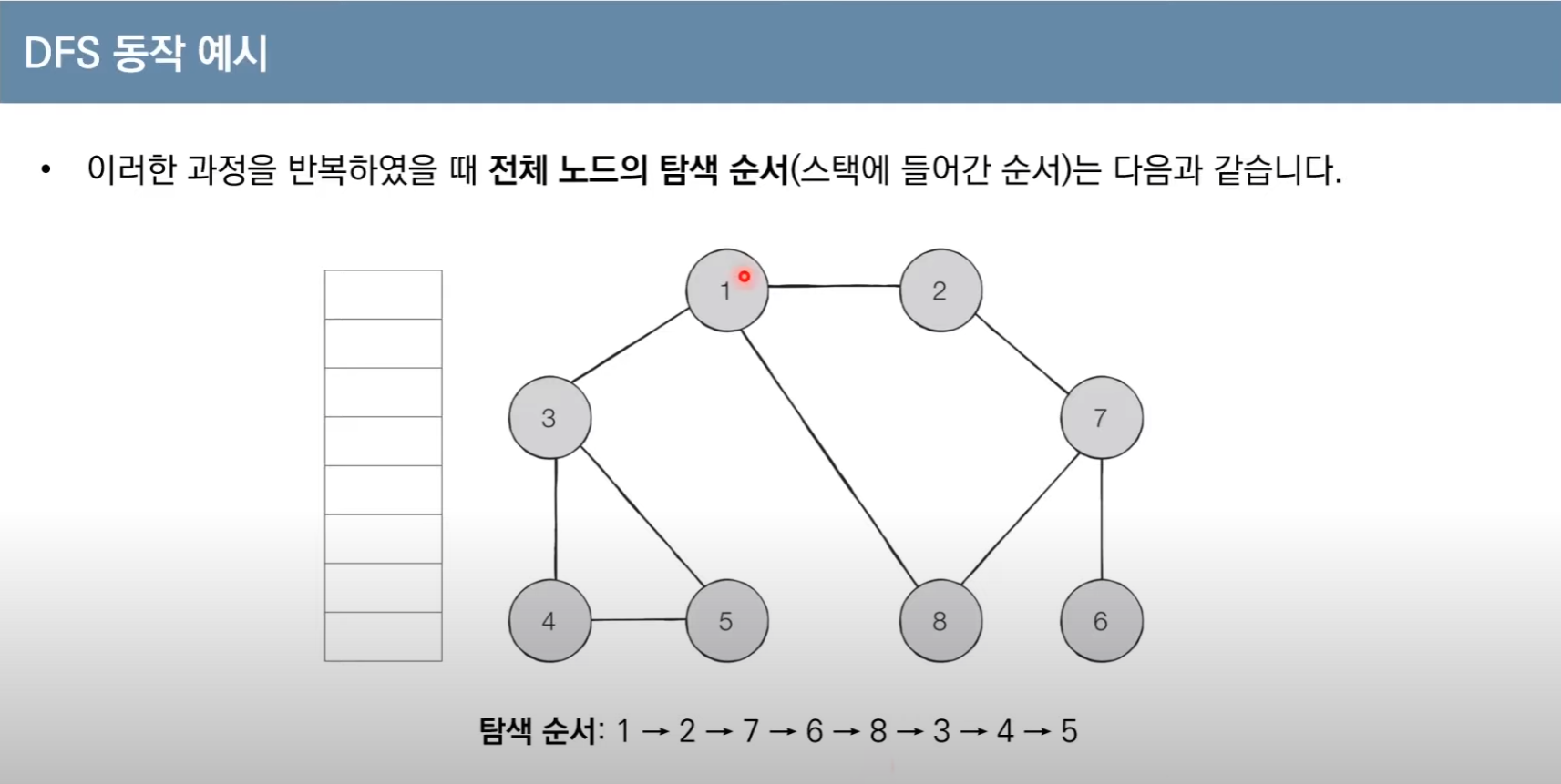 DFS는 스택 자료구조(혹은 재귀함수)를 이용하며, 구체적인 동작 과정은 다음과 같다.