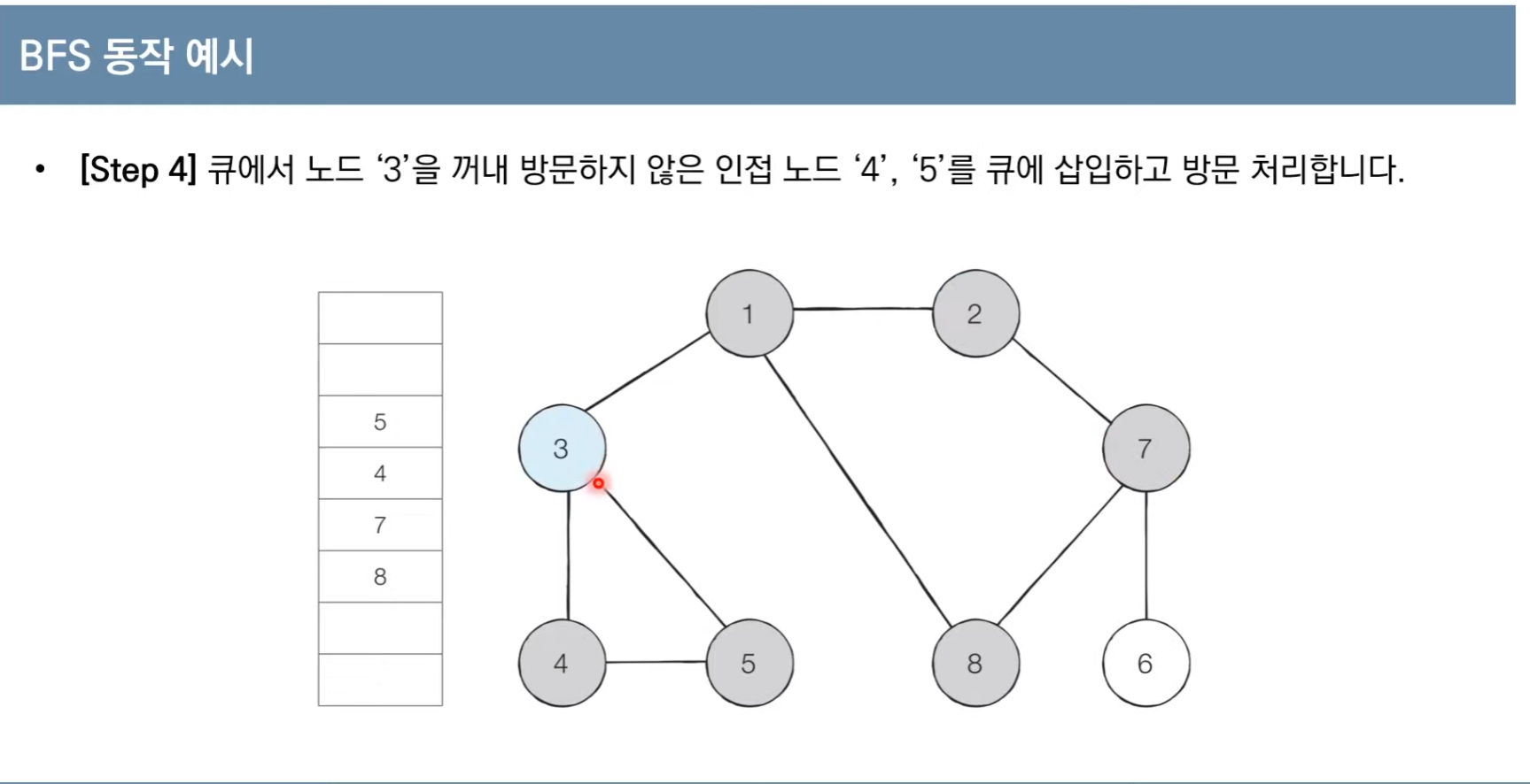 2. 큐에서 노드를 꺼낸 뒤에 해당 노드의 인접 노드 중에서 방문하지 않은 노드를 모두 큐에 삽입하고 방문 처리합니다.