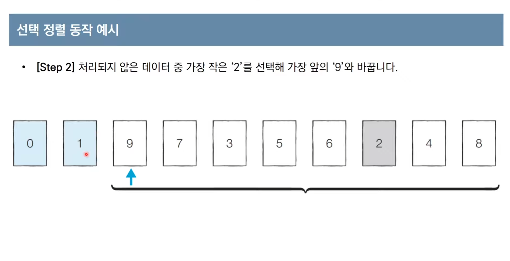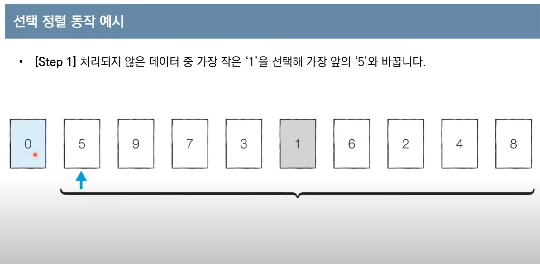 처리되지 않은 데이터 중에서 가장 작은 데이터를 선택해 맨 앞에 있는 데이터와 바꾸는 것을 반복합니다.