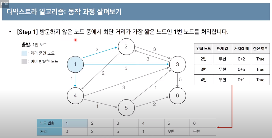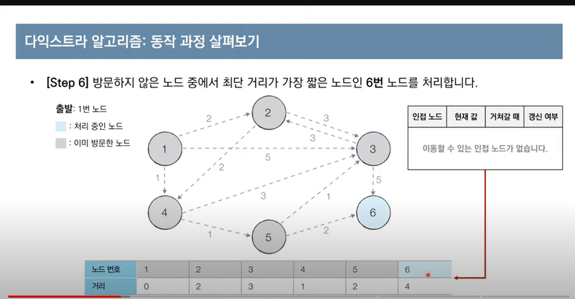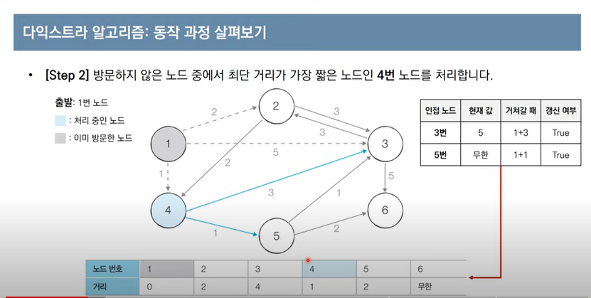 그 방문하지 않은 노드(2, 3, 4, 5, 6) 중에서 1과 가장 가까운 4번 노드를 선택해서 처리할 수 있도록 합니다.