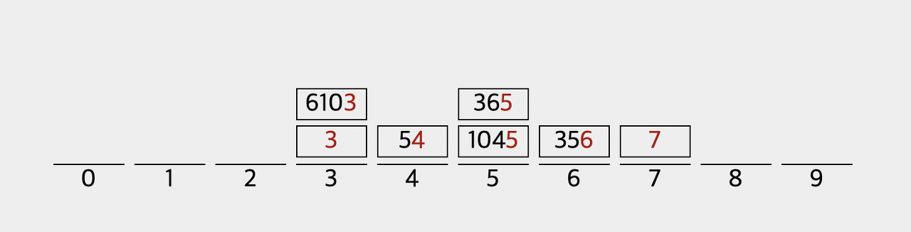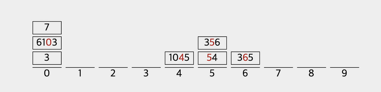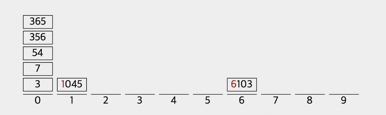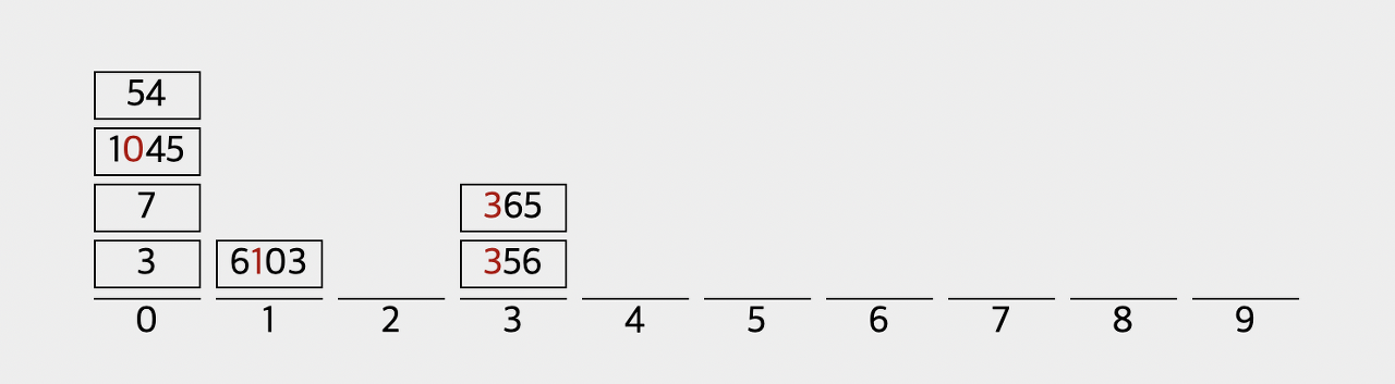 1의 자리 숫자를 0부터 9까지 숫자별로 나누어 놓습니다.