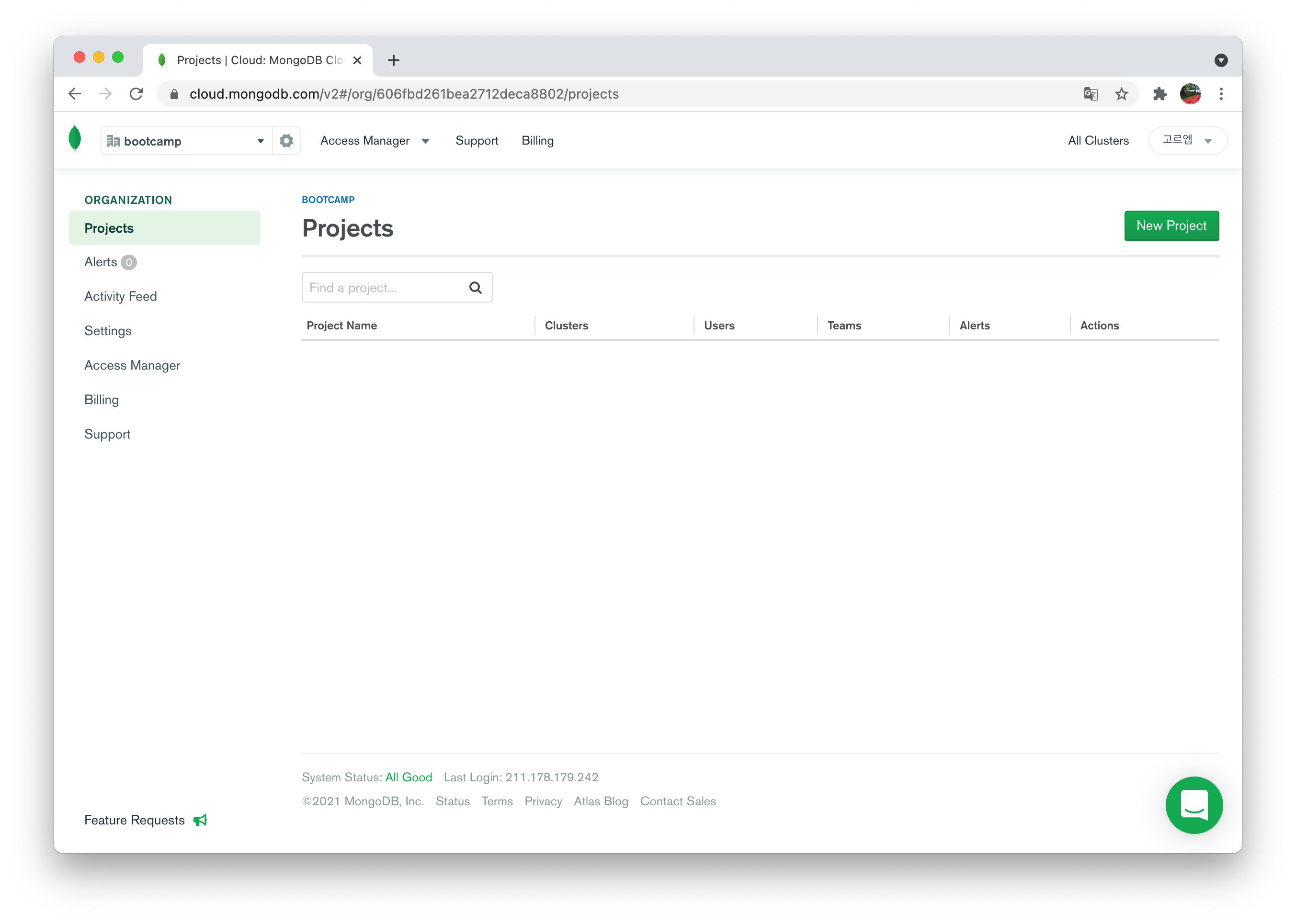 [ 그림 ] Create Organization 선택 - New Project를 누릅니다.