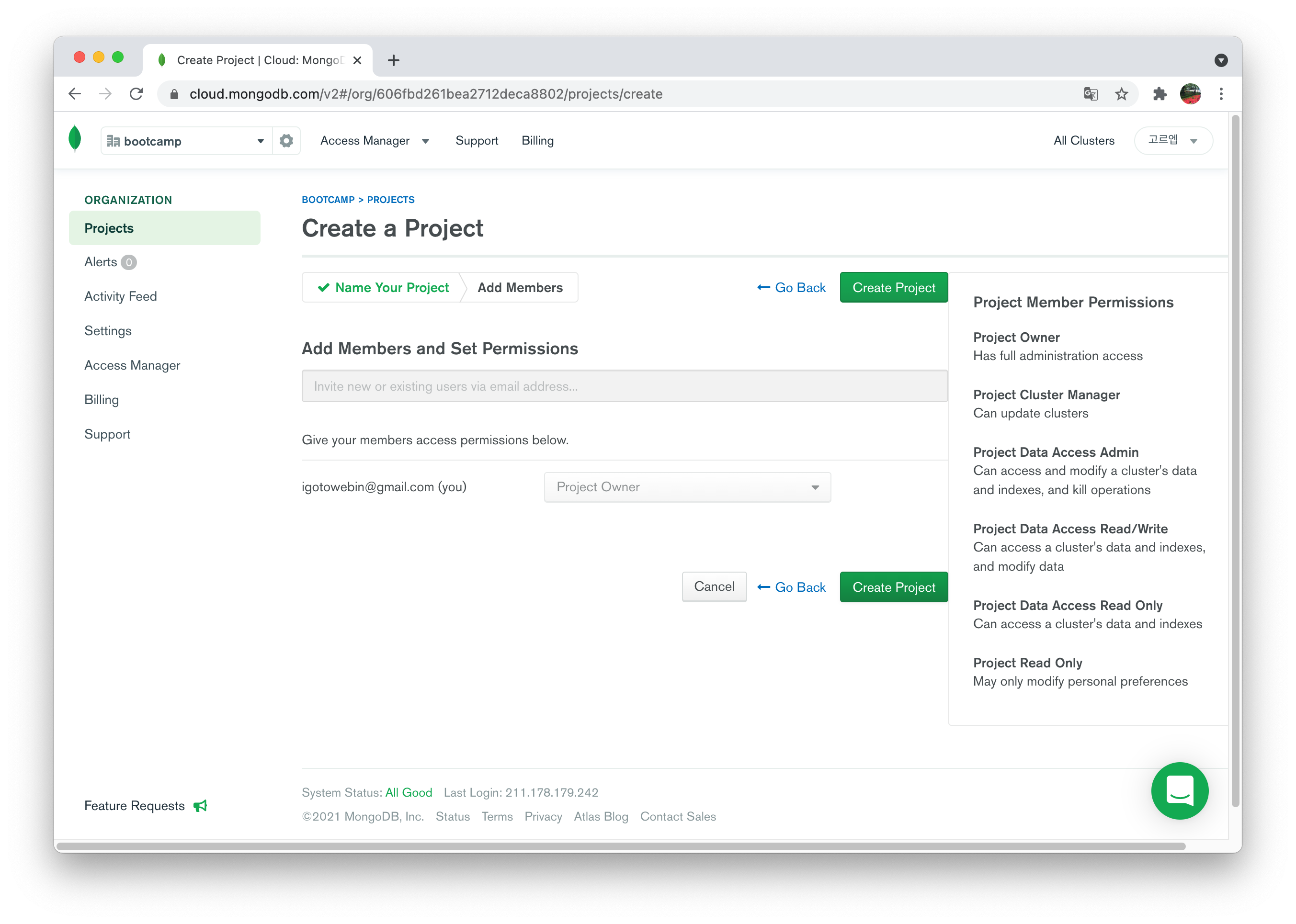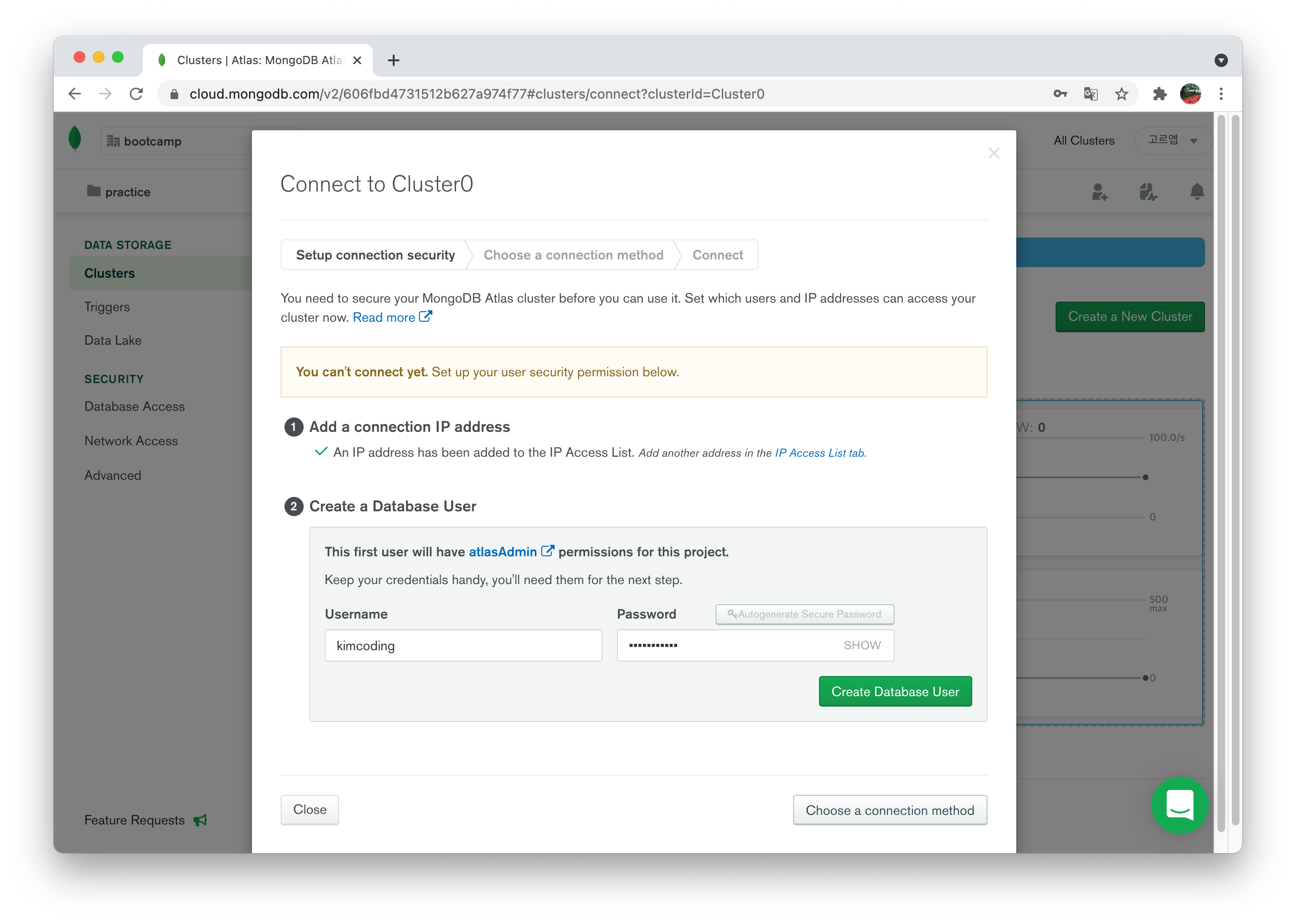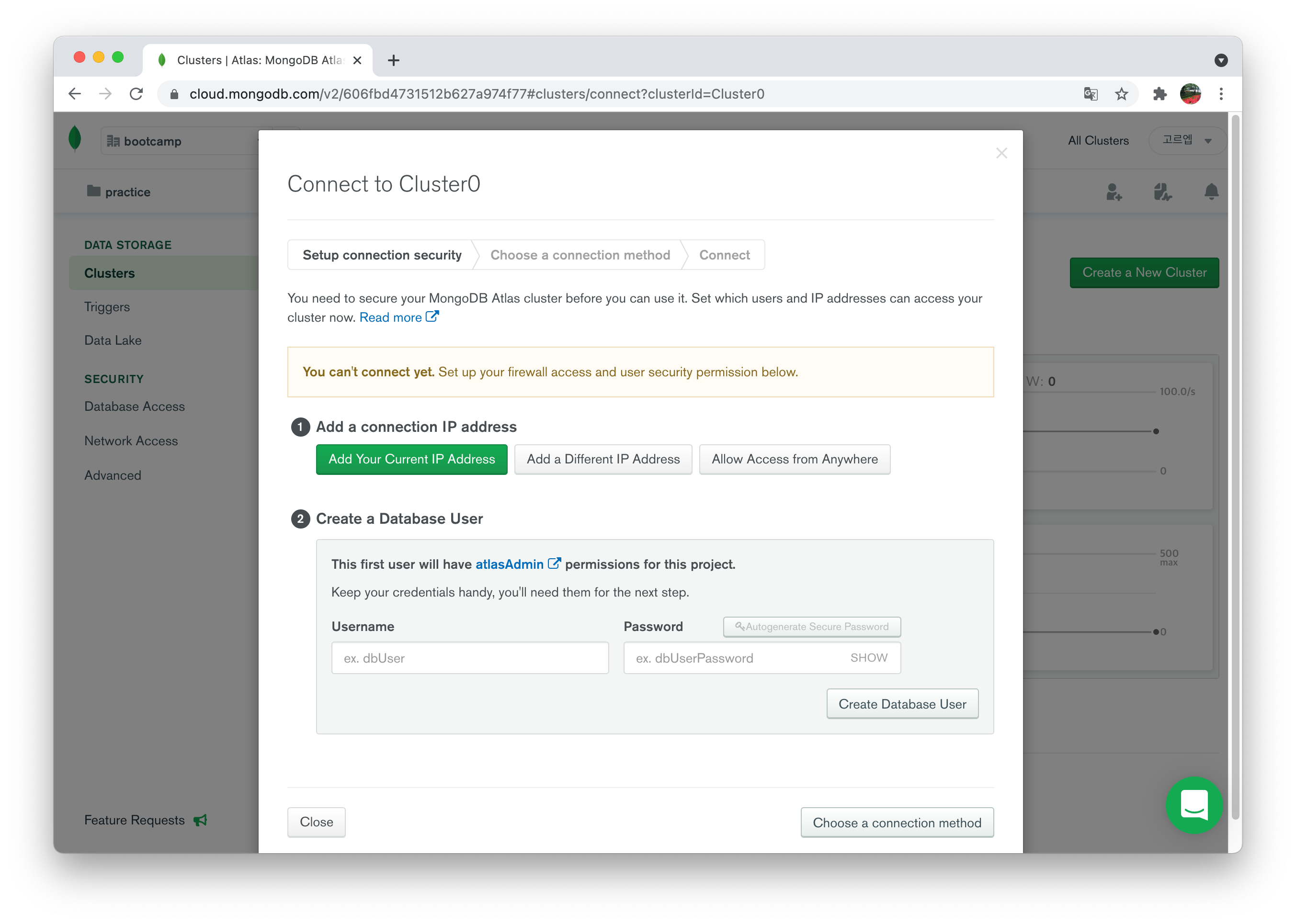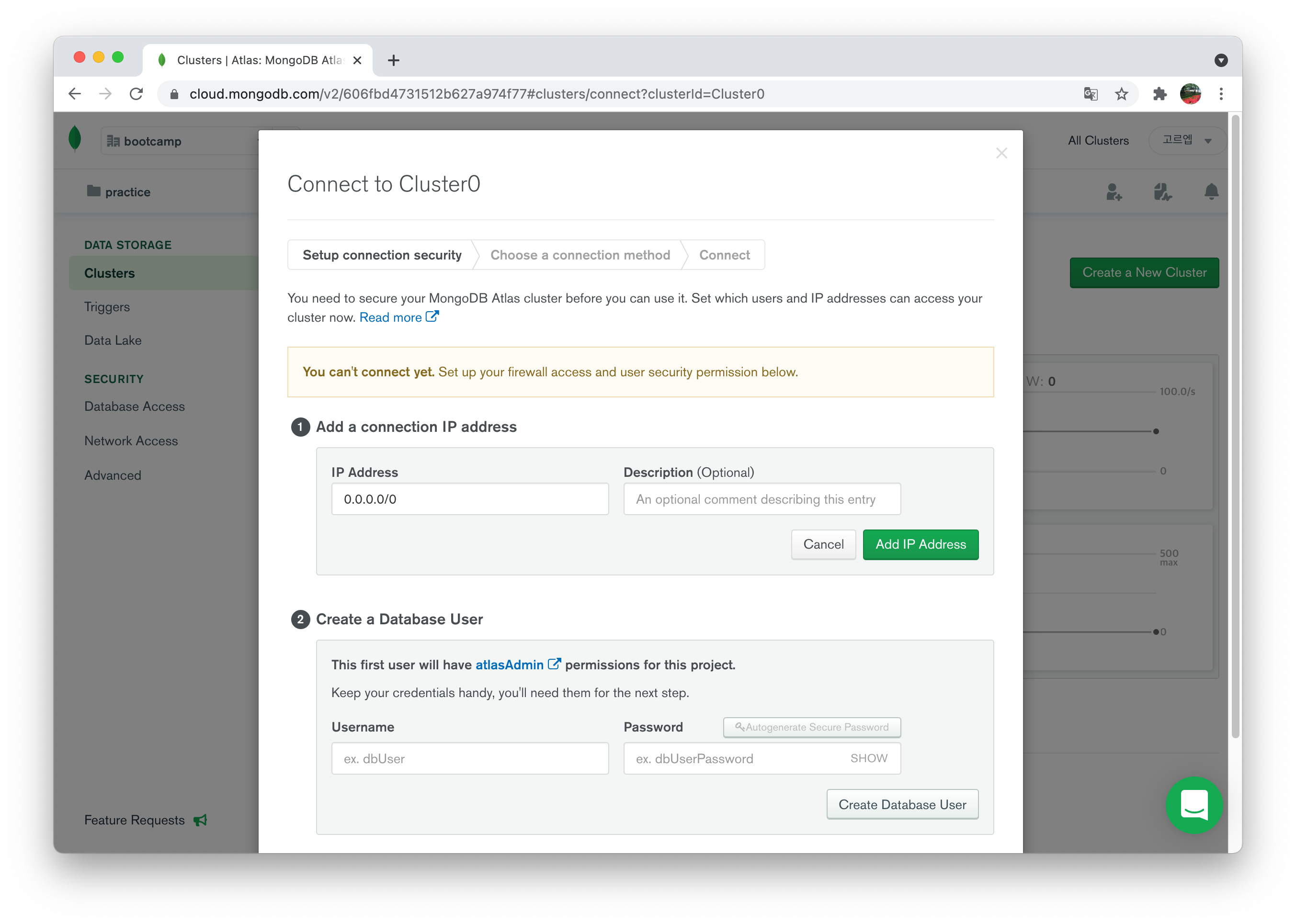 - 이제 Atlas 클러스터가 생성되었으니 여러분의 IP 주소에 대한 액세스 권한을 부여하고 데이터베이스의 유저를 생성해야 합니다.