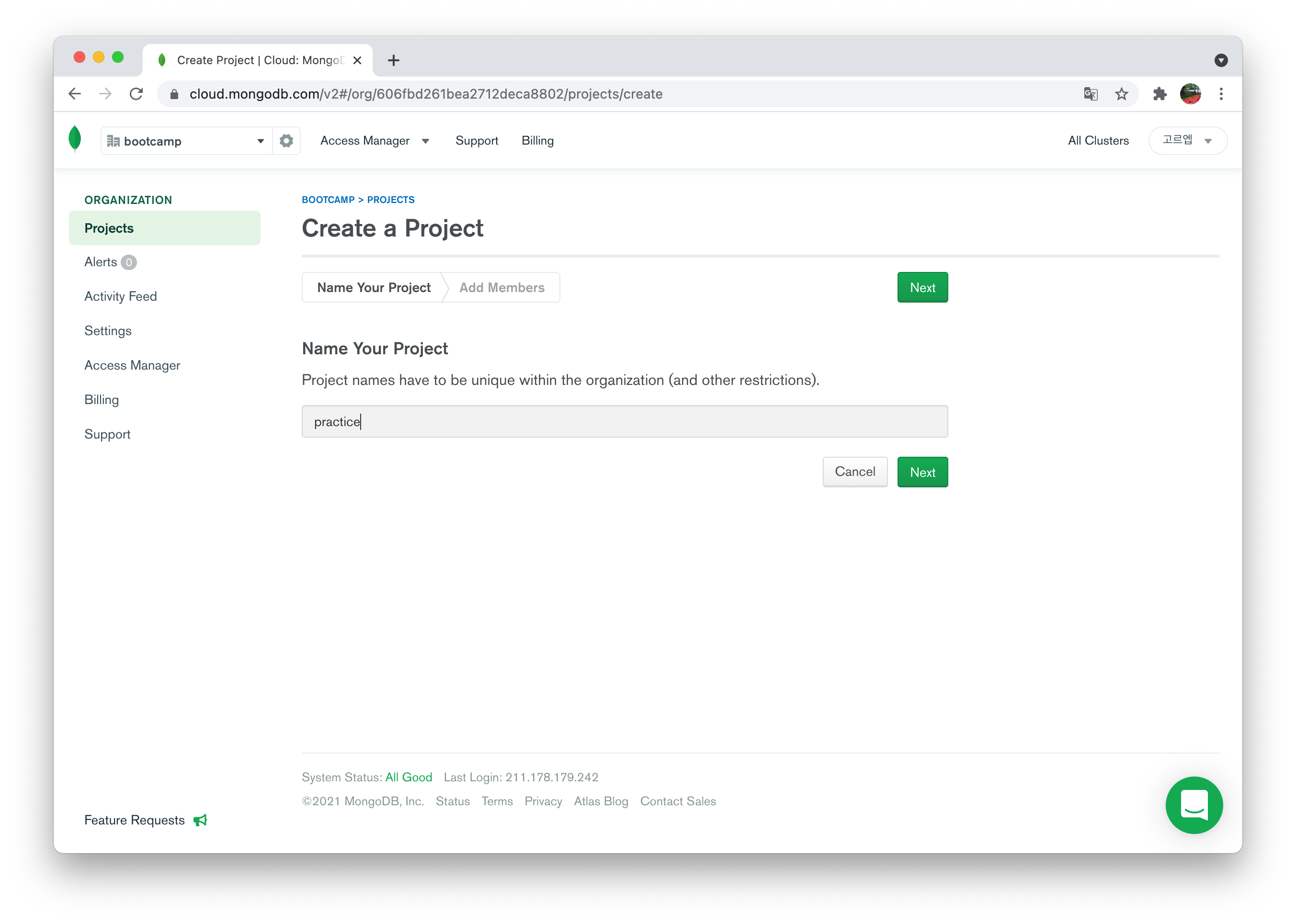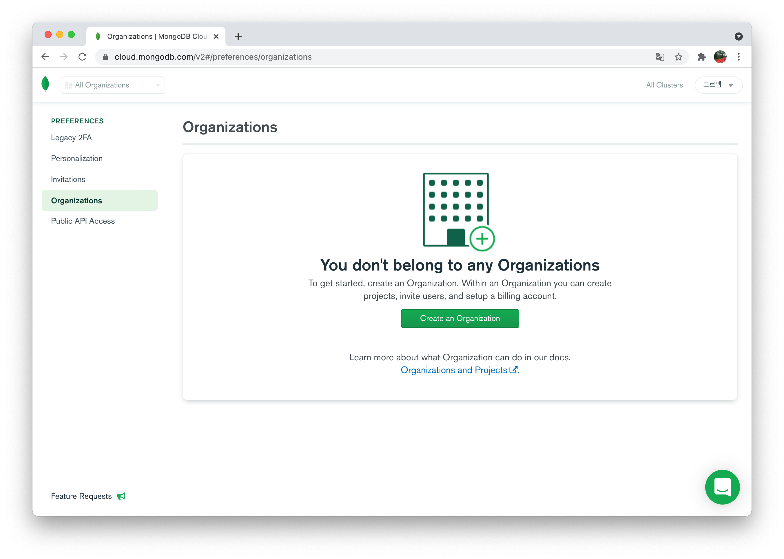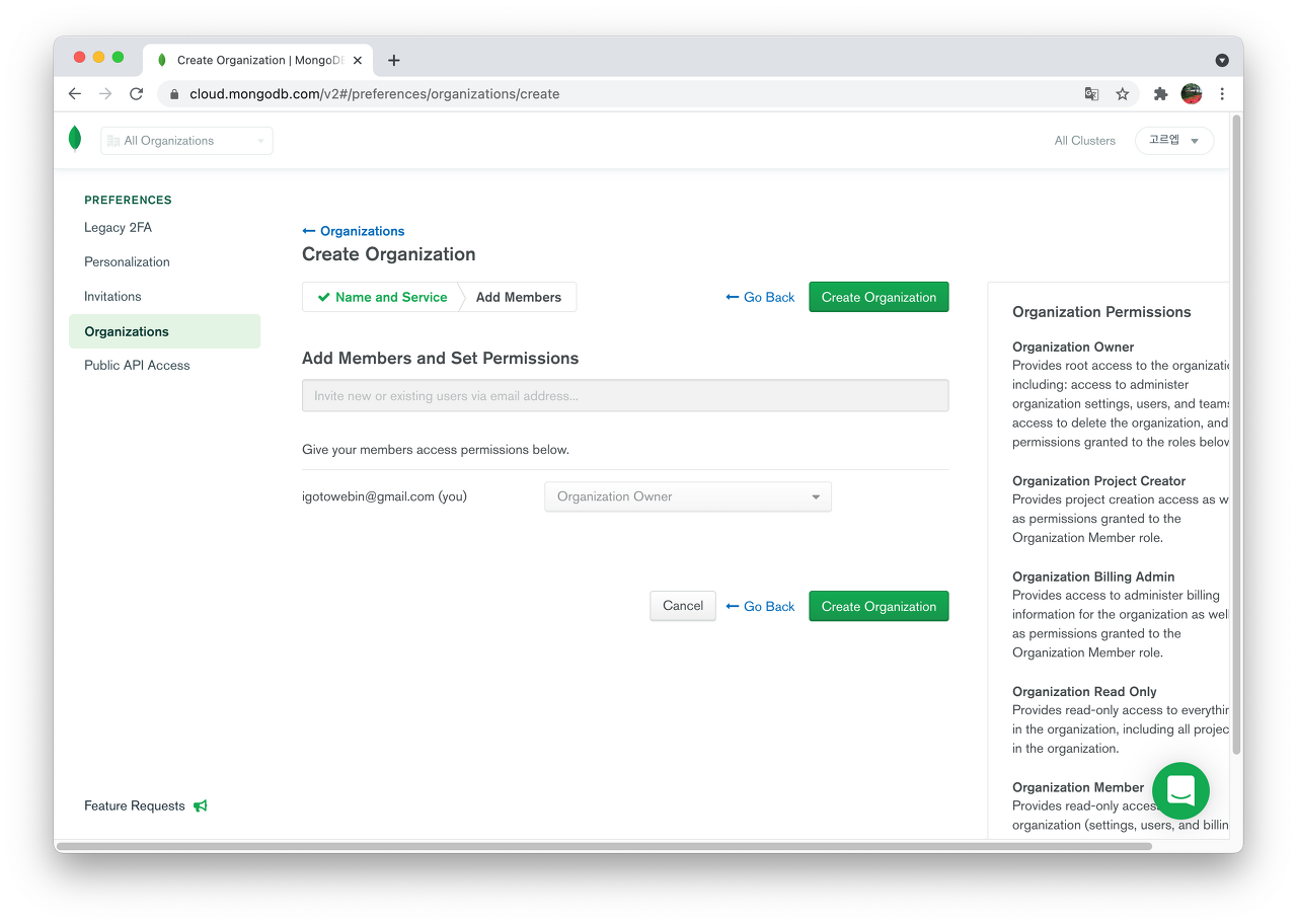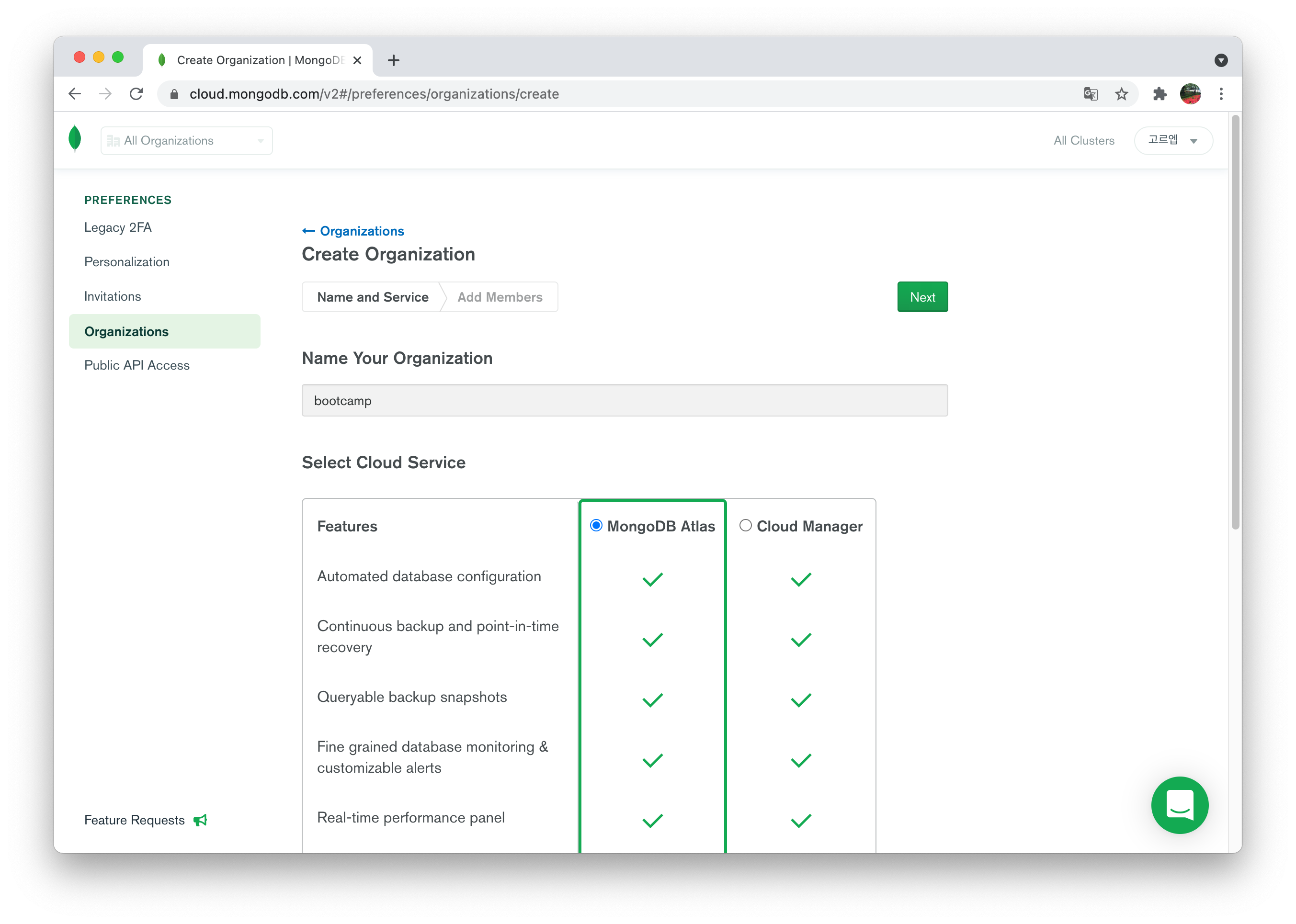 [ 그림 ] Create an Organization을 선택 - 원하는 Organization 이름을 입력합니다. Cloud Service가 MongoDB Atlas로 되어 있는지 확인하고 다음으로 넘어갑니다.