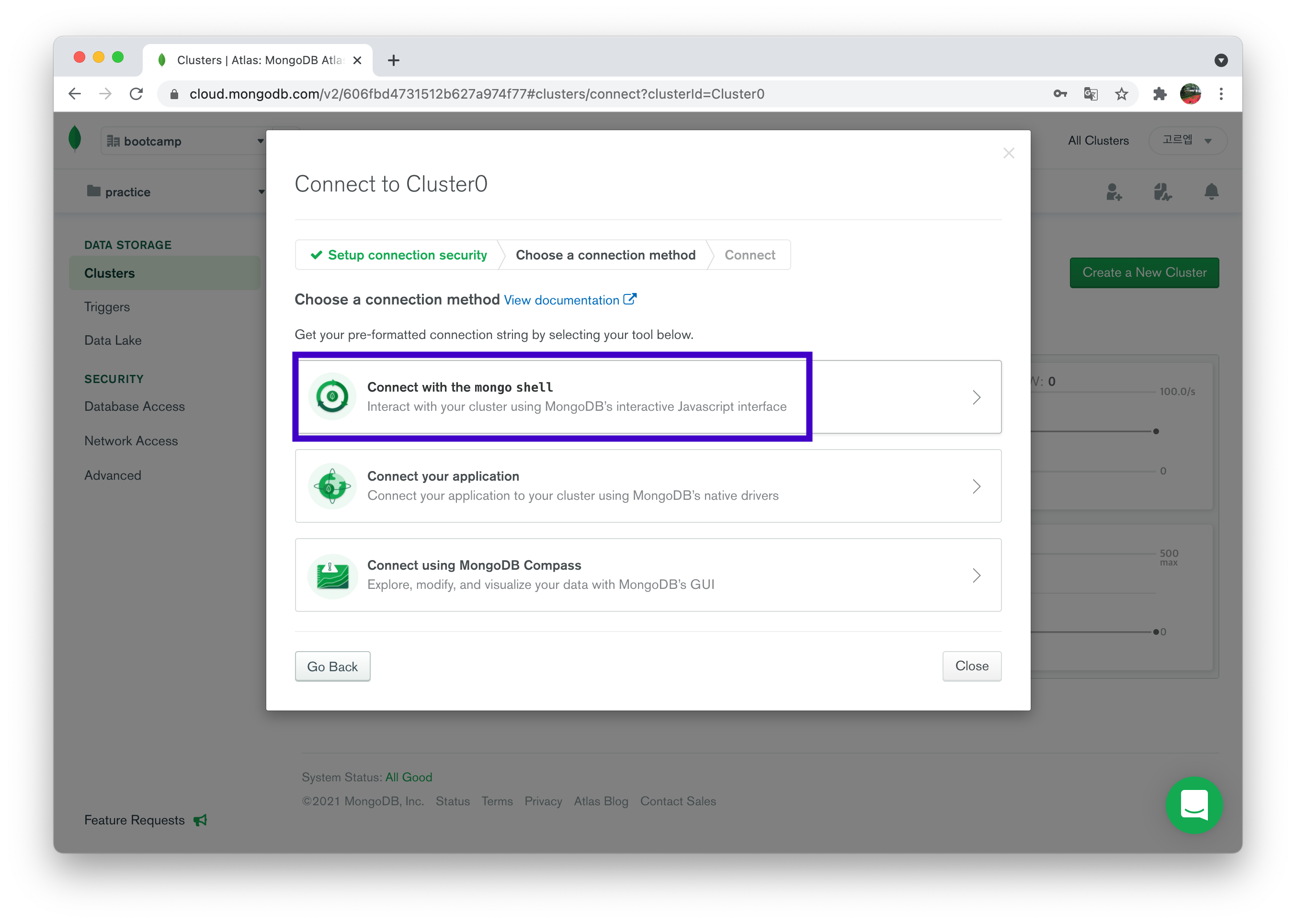 [ 그림 ] Connect with the mongo shell을 선택 - Connect with the mongo shell을 선택하여 아래에 적힌 순서대로 명령을 실행합니다.