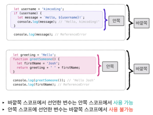 -> 안쪽 스코프에서 바깥쪽 스코프로는 접근할 수 있지만 반대는 불가