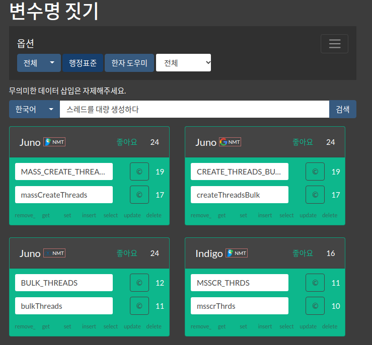 한국어, 일본어, 중국어, 영어로 4개 국어를 지원하며 검색하면 적절한 영어 변수명을 추천해주는 사이트 입니다.