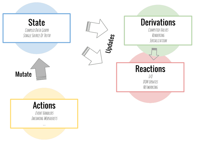 상태를 변경시키는 모든 것을 의미한다. Mobx에서는 모든 사용자의 액션으로 발생하는 상태 변화들이 전부 Derivations와 Reactions로 처리되도록 한다.